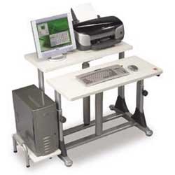 • Two 15-3/4" platforms adjust independently in height from 20–30" • Can be used with kindegarteners or adults • Lower the monitor platform for an unobstructed view of the instructor and then raise it to begin working • Platforms are 1" thick and can hold larger monitors, printers and still have space for writing notes • CPU holders can be attached to inside or outside of frame • Includes desktop grommets and cable management trays